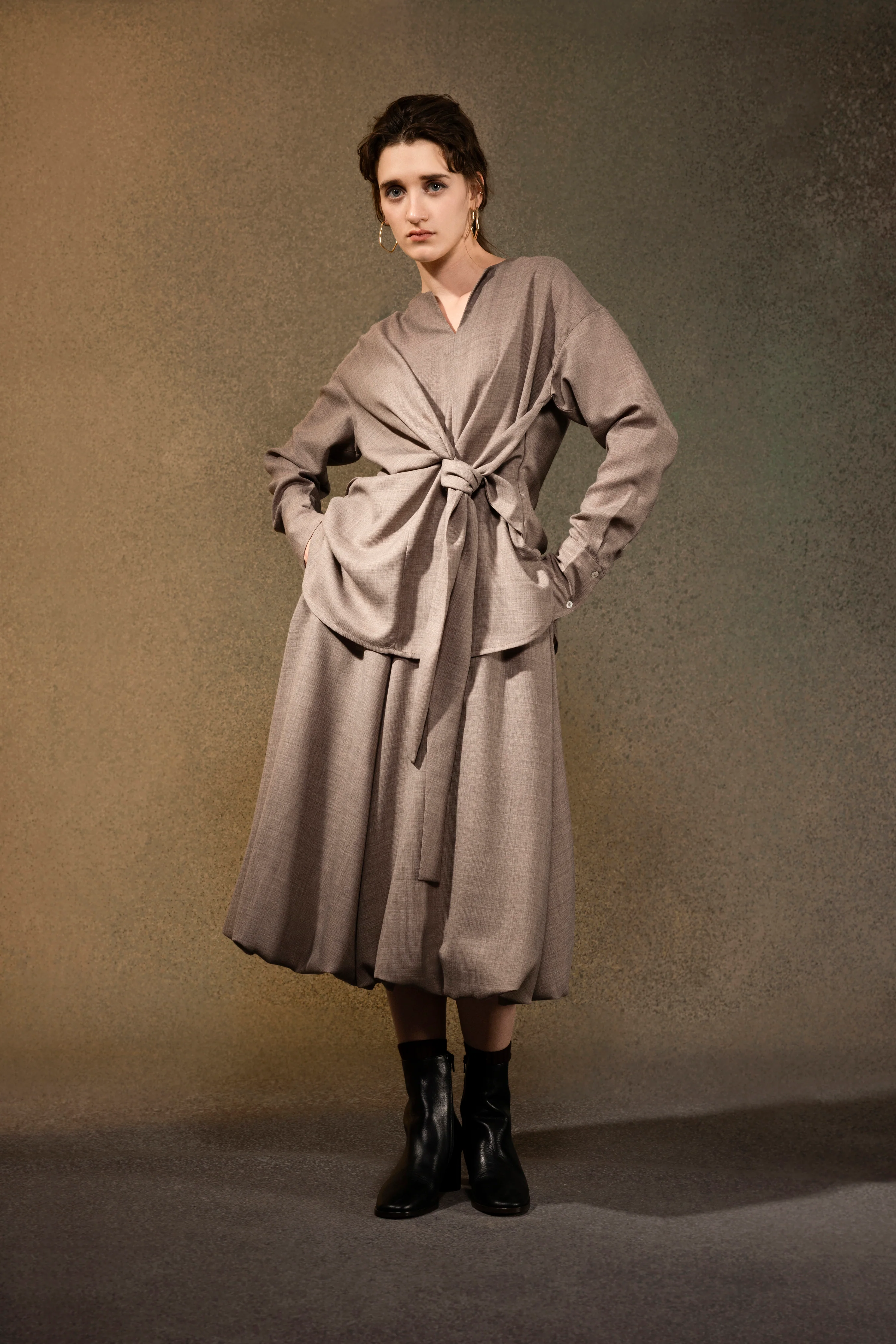 Our Knotted Top is the perfect blend of contemporary and classic sophistication. It is made with premium Japanese fabric with a twisted detail at the waist. The decorative details offer dimensions and layers to the V neckline. A soft and feminine top, pair with our Wool Blend Balloon Skirt for a total look.