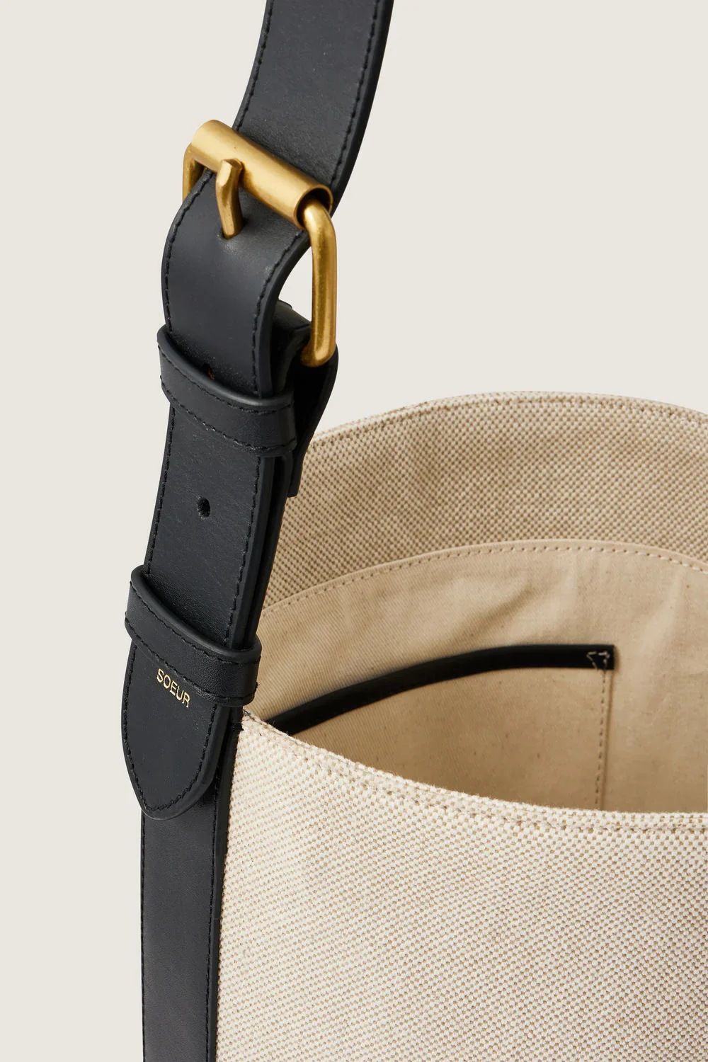 Ecru canvas and soft black leather bucket bag