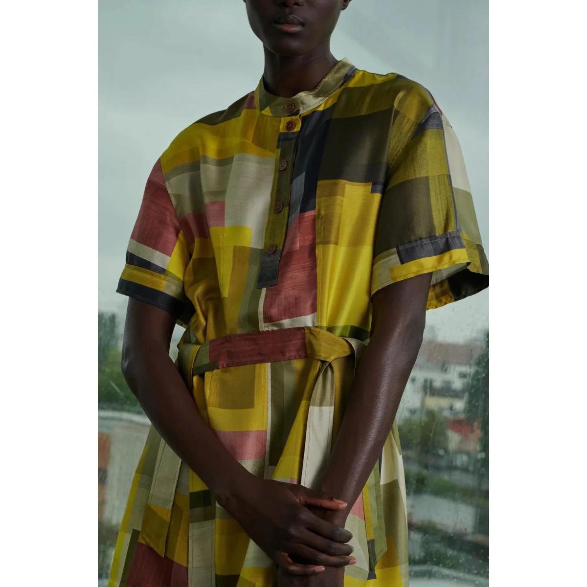 This dress in yellow and khaki hues offers a unique and stylish look.